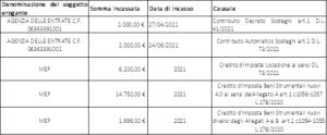 Ai fini di adempiere all’informativa, richiesta dall’art. 1, co. 125-bis della Legge 4 agosto 2017, n. 124, riguardante il ricevimento di sovvenzioni, sussidi, vantaggi, contributi o aiuti, in denaro o in natura, non aventi carattere generale e privi di natura corrispettiva, retributiva o risarcitoria effettivamente erogati dalle Pubbliche Amministrazioni di cui all’art. 1, co. 2 del decreto legislativo 30 marzo 2001, n. 165 e dai soggetti di cui all’art. 2-bis del D.lgs. 14 marzo 2013, n. 33 si riportano di seguito le somme percepite dalla Società nel periodo intercorrente tra il 1° gennaio 2021 ed il 31 dicembre 2021: